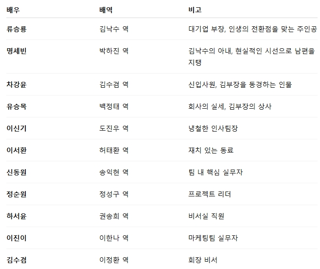 - 류승룡의 생활 연기: ‘극한직업’ 이후 또 한 번, 현실적인 직장인 연기로 큰 호평을 받고 있습니다. 직장인의 무기력함과 집안 가장의 부담을 자연스럽게 표현해 “역시 류승룡”이라는 말이 나오기도 합니다.