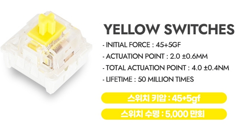 적축과 비슷한 성향의 황축은 저소음과 낮은 키압으로 업무용 등 저소음이 필요한 환경에서 사용하기에 좋습니다. 또한 저렴한 모델에는 잘 탑재되지 않는 교체가 편리한 퀵스압 타입의 설계로 고장이나 축교체를 하고 싶다면 편리하게 할 수 있어서 가성비가 높습니다.