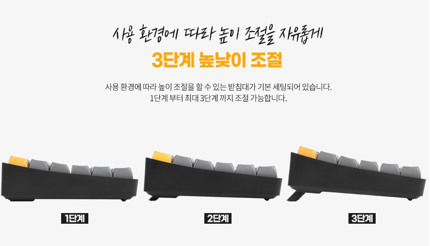 키캡 부분에서도 신경을 많이 써서 이색 사출 PBT 키캡 방식으로 한글폰트를 레이저 프린트하여서 높은 내구성과 품질을 보여주고 있습니다. 고가의 기계식 키보드의 키감성을 따라가기는 조금 부족하나 가격을 생각하면 품질이 낮다고 말하기 어렵습니다. 저렴한 모델임에도 높이조절이 2단계로 가능한 점도 좋은 부분입니다.
