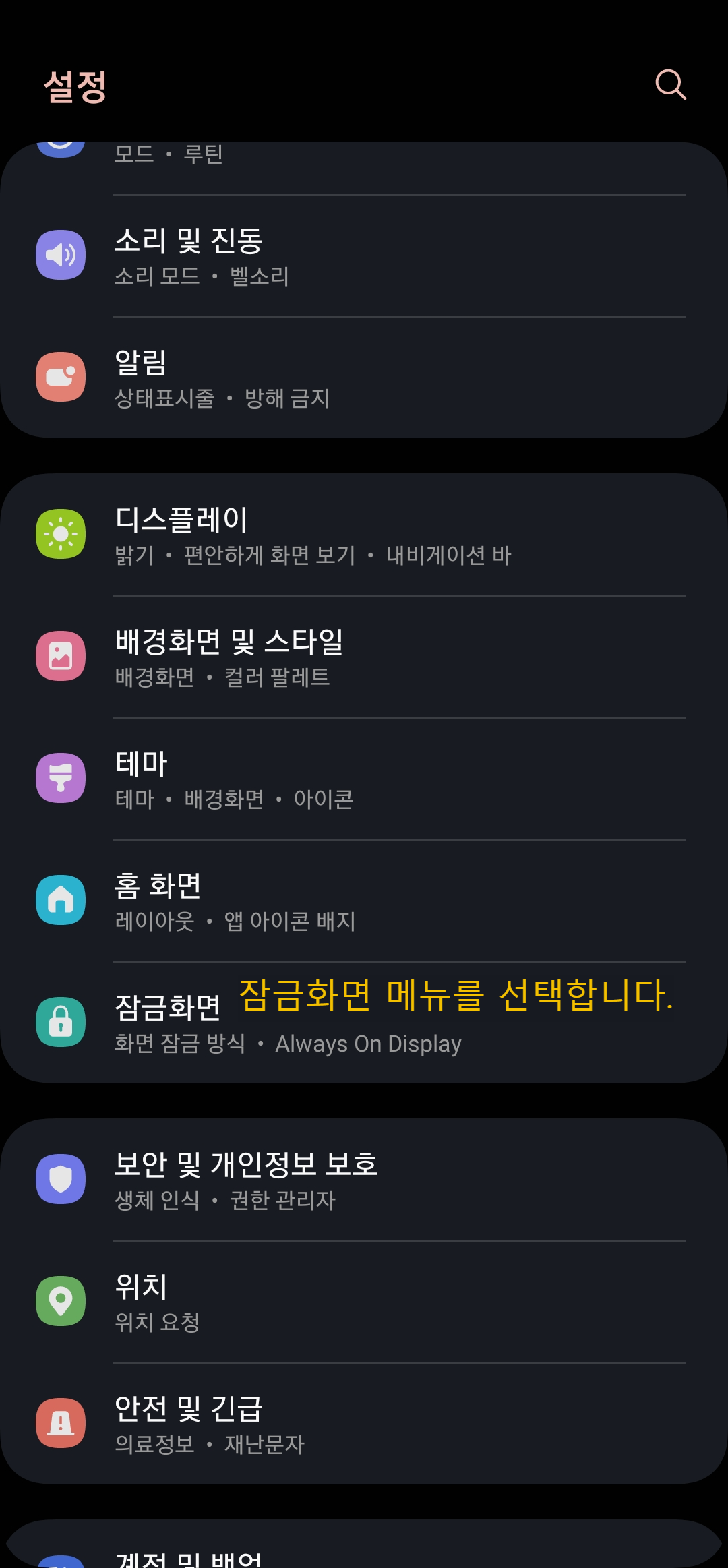 앱화면에서 설정을 검색해서 설정 화면으로 이동하면 하단에 잠금화면 메뉴를 선택한 후에 위젯 메뉴를 선택합니다.