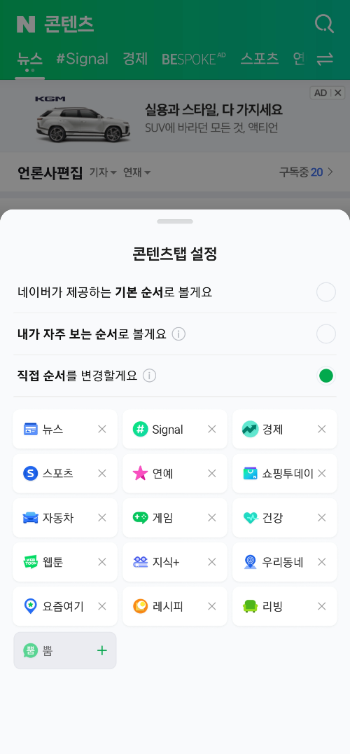 개인적으로는 뉴스를 가장 먼저 확인하는 것을 좋아해서 시그널을 두 번째로 설정해서 편리하게 사용하고 있는데 실검순위가 항상 궁금하신 분들이라면 첫 번째로 설정해서 사용하면 앱을 켜면 검색순위가 바로 나오게 되는데 취양에 맞게 설정하면 편리하게 사용이 가능합니다.