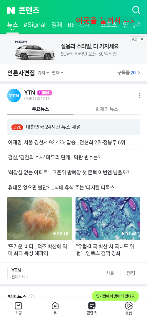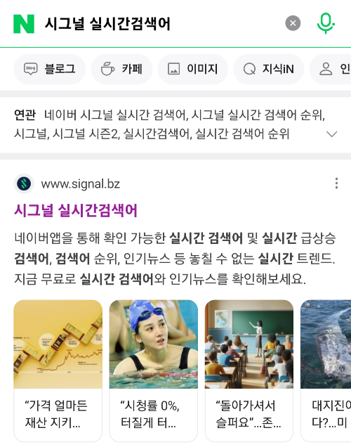 1) 네이버 앱을 실행해서 검색창에 시그널 실시간 검색어를 검색해서 들어갑니다.