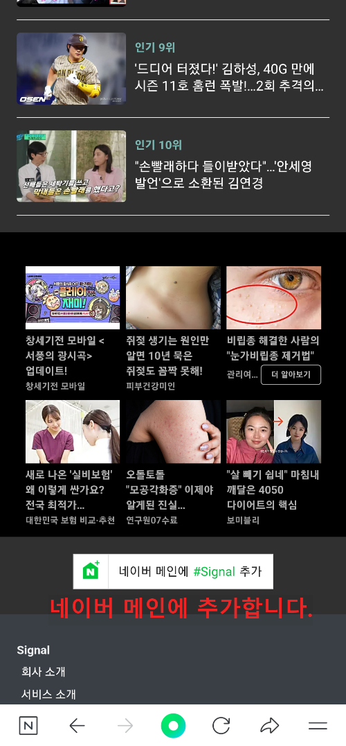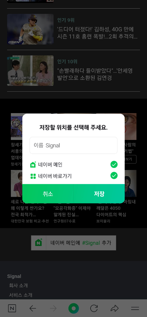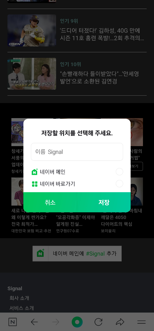 2) 사이트에서 하단으로 스크롤해 보면 네이버 메인에 시그널 추가하기를 눌러서 네이버 메인, 바로가기를 선택한 후 저장합니다.