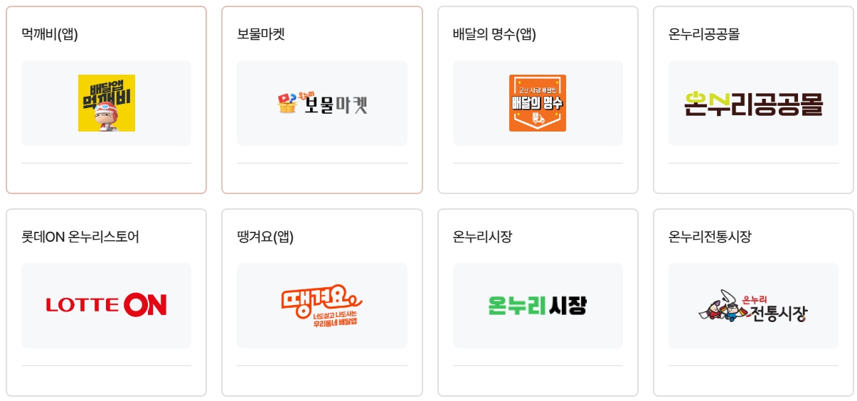 그리고 온라인에서는 온누리몰, 인더마켓, 가치삽시다, e경남몰 등에서도 사용할 수 있어서 식재료, 밀키트, 생활용품, 심지어 소형가전까지 구매할 수 있어요.