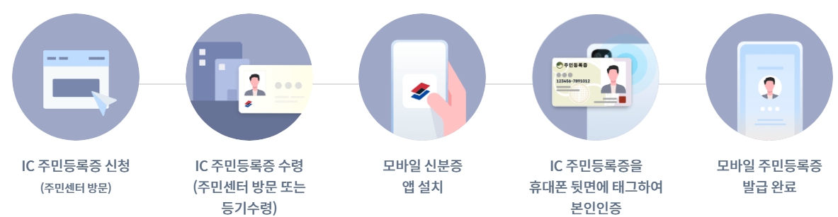 가장 간편한 방법으로 IC주민등록증 주민센터에 신청 후 수령하면 모바일 신분증 앱을 설치해서 모바일 운전면허증 등록방법과 동일하게 태그 하여서 본인인증 후 발급하여서 사용할 수 있습니다.