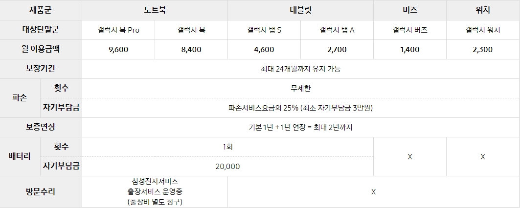 매월마다 일정한 요금을 지불하면 삼성 정식 서비스센터에서 수리받는 금액에 대해서 일정한 자기 부담금을 지불하면 저렴하게 수리가 가능합니다. 하드웨어, 배터리 교체, 침수 손상, 도난, 분실등 기존에 통신사에서 제공하고 있던 핸드폰 보험과 비슷합니다. 스마트폰은 3년 동안 가입이 가능하고 태블릿, 버즈, 워치등은 24개월 동안 가입이 가능하고 보증기간은 모두 1년씩 연장이 됩니다.
