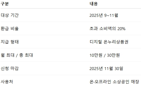 2025년 9월부터 11월까지 지난해보다 카드 사용액이 늘어나면, 늘어난 금액의 20%를 디지털 온누리상품권으로 환급해주는 제도예요.