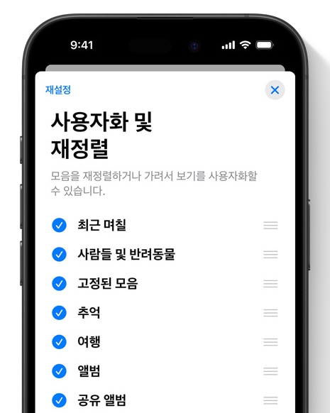 주제별로 보관함을 정렬하고 사용자가 원하는 순서로 앨범의 주제를 편집할 수 있어서 원하는 사진을 보다 쉽게 찾아볼 수 있습니다.
