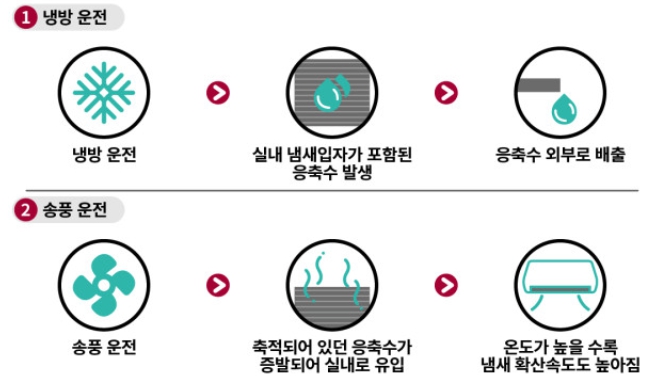 에어컨은 냉방을 위해 내부에 차가운 공기를 순환시키는 원리인데 이 과정에서 습기가 발생합니다. 여름철에는 장마와 같이 비가 많이 오고 전체적으로 습한 날씨가 유지되기 때문에 습도로 인해서 에어컨 내부가 축축해지면서 곰팡이와 세균이 번식하게 되어 불쾌한 냄새가 나게 됩니다.