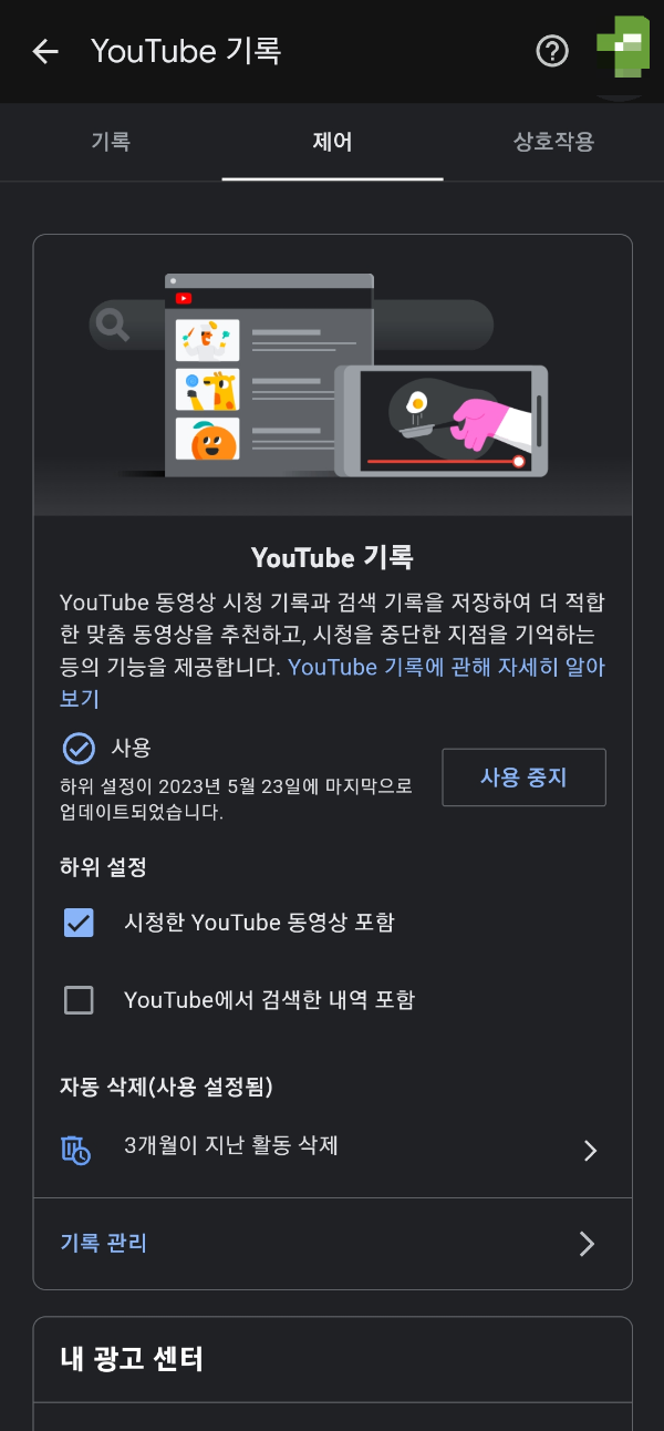 시청기록과 검색 기록을 저장하여 더 적합한 맞춤 동영상을 추천하는 기능에 사용 표시가 되어있다면 사용 중지를 눌러서 중지시키면 유튜브 검색기록을 삭제할 수 있습니다.