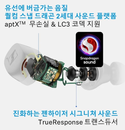 7mm 다이내믹 드라이버를 통해서 음질의 왜곡 없이 젠하이저 특유의 선명하고 공강 감 있는 사운드에서 더 강력한 베이스를 느낄 수 있습니다. aptX TM 무손실 오디오 코덱을 탑재하여서 고음질의 음악을 듣는 마니아들을 만족시킬 수 있고 LE Audio의 LC3 코덱을 지원하여서 기존의 SBC코덱보다 50% 효율적인 전송이 가능합니다.