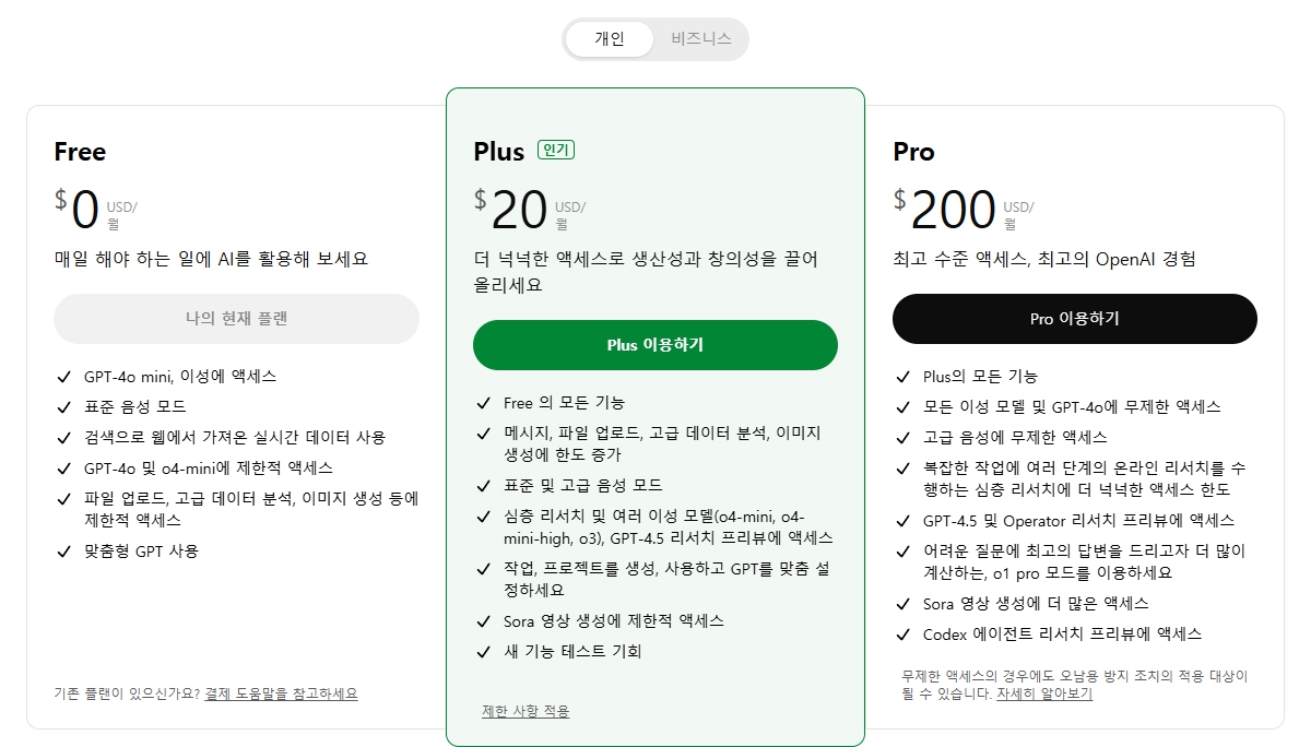 - 추가 기능 : DALL·E 이미지 생성, 고급 데이터 분석 등 다양한 추가 기능을 제공합니다.