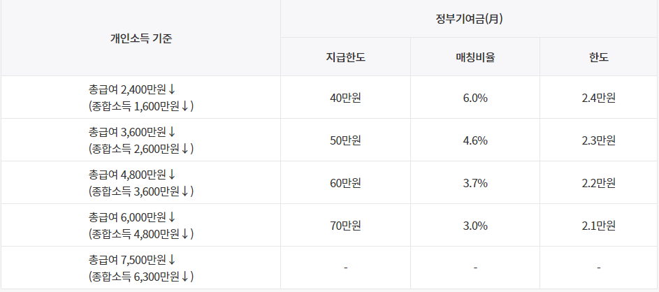매칭비율(지원금) 3~6% 소득에 따라 다름 아래 매칭비율 참고.