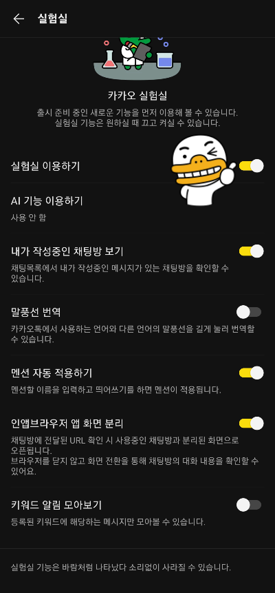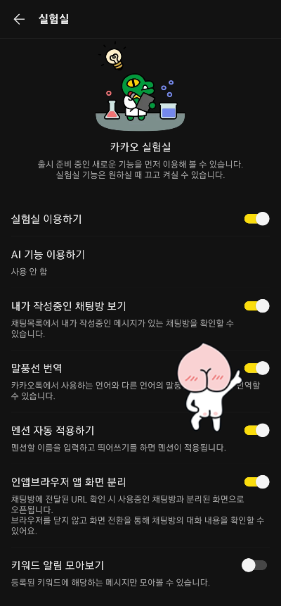 - 실험실 이용하기를 설정하고 하단에 말풍선 번역기능도 사용하기로 바꾸어 줍니다.