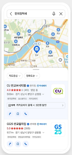 5. 편의점 선택하기 : 가까운 편의점을 선택합니다. GS25, CU, 세븐일레븐, 이마트24 중에서 선택할 수 있습니다.