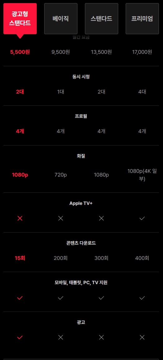 광고가 불편하신 분들은 베이식 월요금이 9,500원부터 프리미엄이 최대 17,000원까지 있는데 통신사를 통해서 구독하면 할인되는 경우가 있으니 이용하는 통신사에 문의해서 할인된 금액으로 구독하시는 것을 추천합니다.