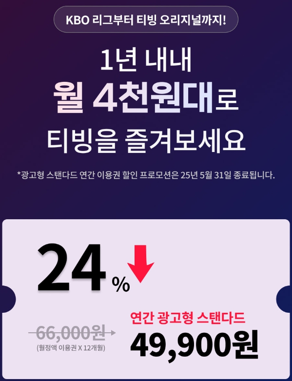 이렇게 하면 KBO를 볼 준비는 완료되었지만 한 가지 남은 것이 있는데 아쉽게도 티빙에서 프로야구를 보려면 유료 구독을 해야 볼 수 있습니다.