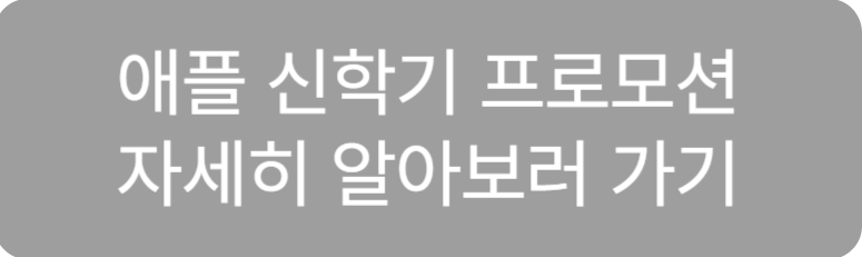 할인을 잘 안 하기로 유명한 애플도 학생들을 위해서는 매년 특별할인 행사를 진행하고 있습니다. 2024년 애플 신학기 프로모션 기간은 1월 4일부터 3월 13일까지 진행됩니다. 재고 상황에 따라서 사전 통보 없이 조기 마감하는 경우도 있으니 새로운 제품을 구매하려고 하시는 분들은 서둘러서 저렴하게 구매하시는 것이 좋습니다.