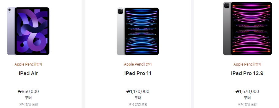 9세대 모델 이 47만 원 플래그쉽 모델인 아이패드 프로가 117만 원부터 시작하고 있습니다.