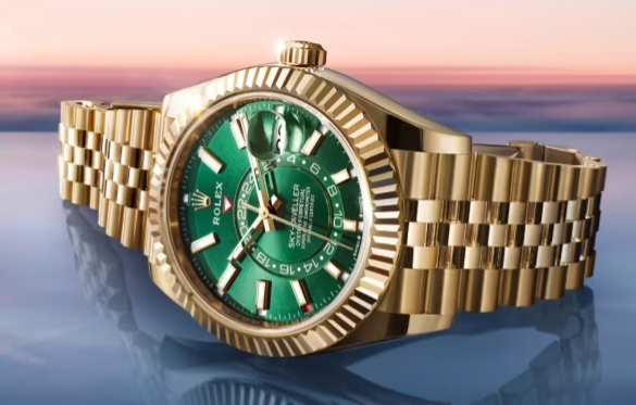 스카이-드웰러도 롤렉스의 시그니처 색상인 녹색 다이얼과 18캐럿 옐로 골드 소재의 케이스와 브레이슬릿을 조합하여 가장 인기 있을 만한 조합을 새롭게 선보였습니다.