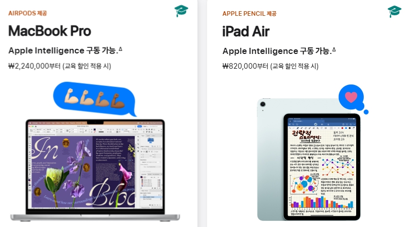 대학생들에게 가장 인기 있는 맥북 프로 모델은 224만 원 아이패드 에어 모델은 82만 원으로 최저가보다 10% 정도 싸게 구매가 가능합니다.