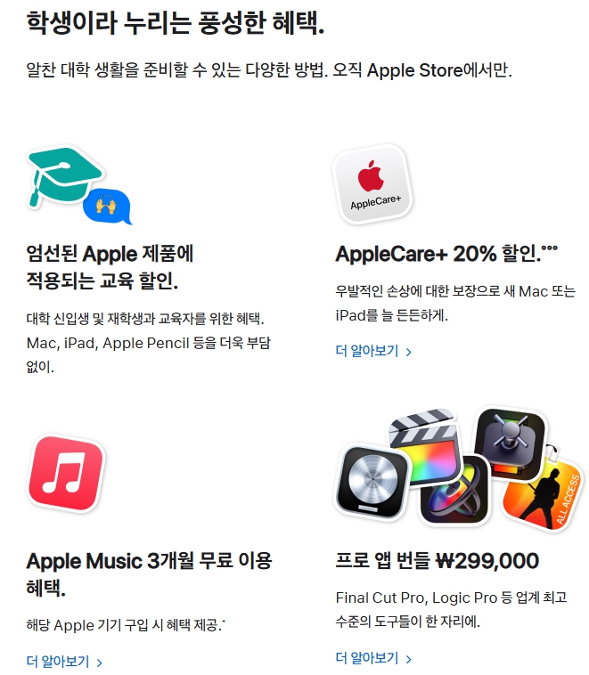 이외에도 우발적인 손상에 대한 보장인 애플케어의 20% 할인과 애플뮤직 3개월 무료이용의 혜택이 있고 다양한 멀티미디어 작업을 도와주는 파이널 컷프로와 로직프로등의 프로앱번들인 299,000원에 구입할 수 있는 혜택이 있기 때문에 대학에 입학하는 신입생이나 대학생들 또는 새로운 기기를 구입하려는 교육에 관련된 분들에게 매력적인 기회라고 생각됩니다.