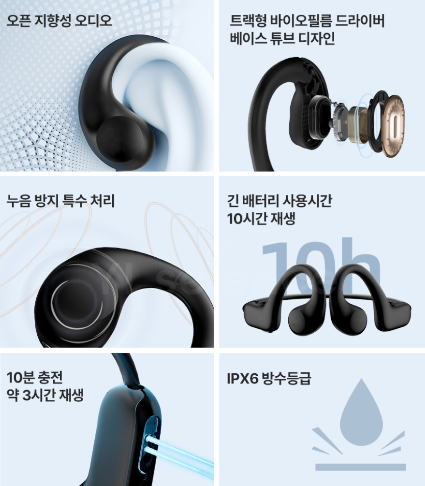 IPX6 등급의 준수한 방수 성능으로 땀이나 비등의 노출에도 부담 없이 사용할 수 있습니다. 10시간의 사용시간과 블루투스 5.3V을 가지고 있어 우수한 연결성과 사용 성을 가지고 있습니다.