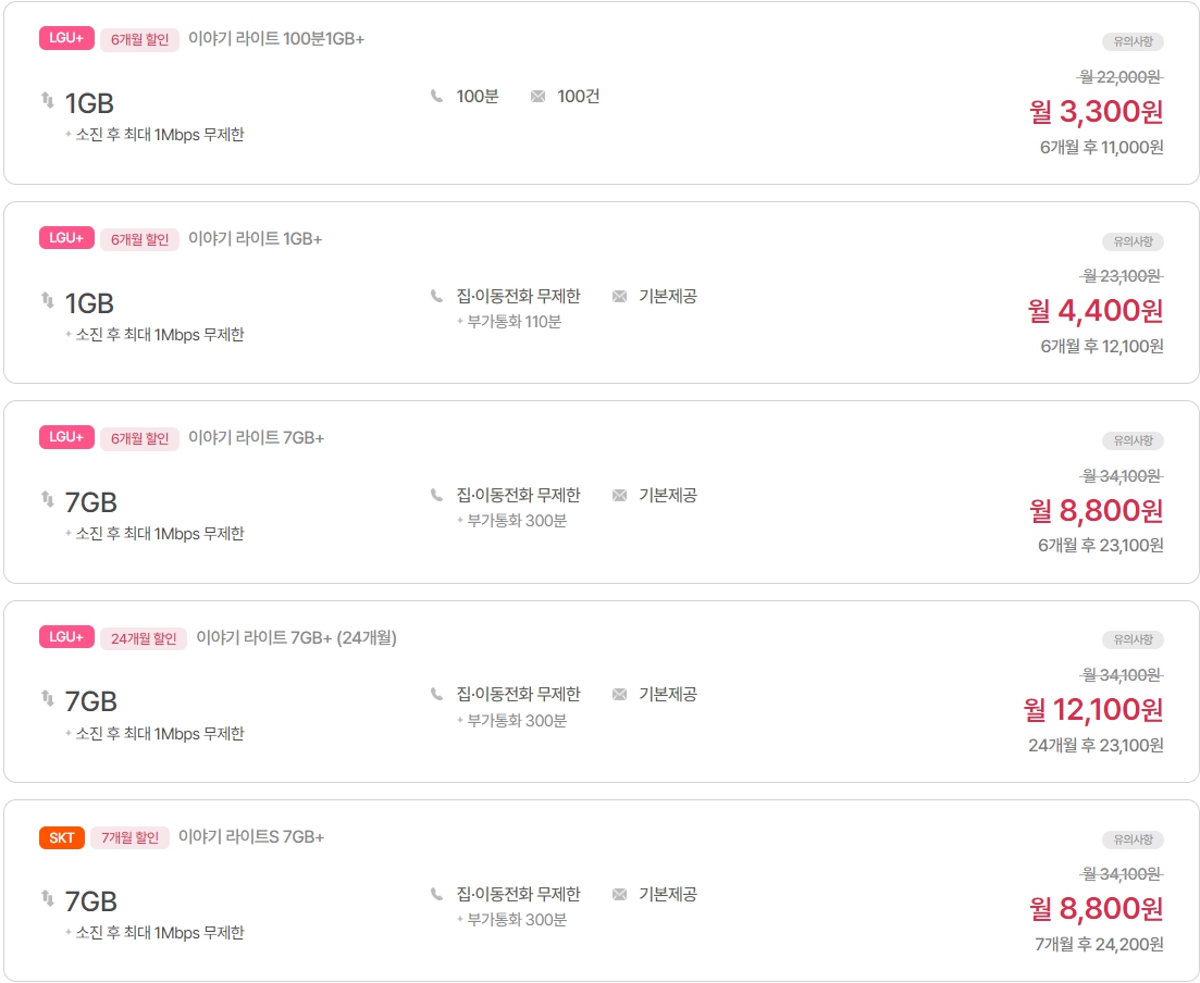 알뜰폰 요금제는 통신사 회선도 다양하게 고를 수 있으나 가장 매력적이여 보이는 상품들만 보여드렸는데 더 다양한 옵션들은 홈페이지에서 확인 가능 합니다.