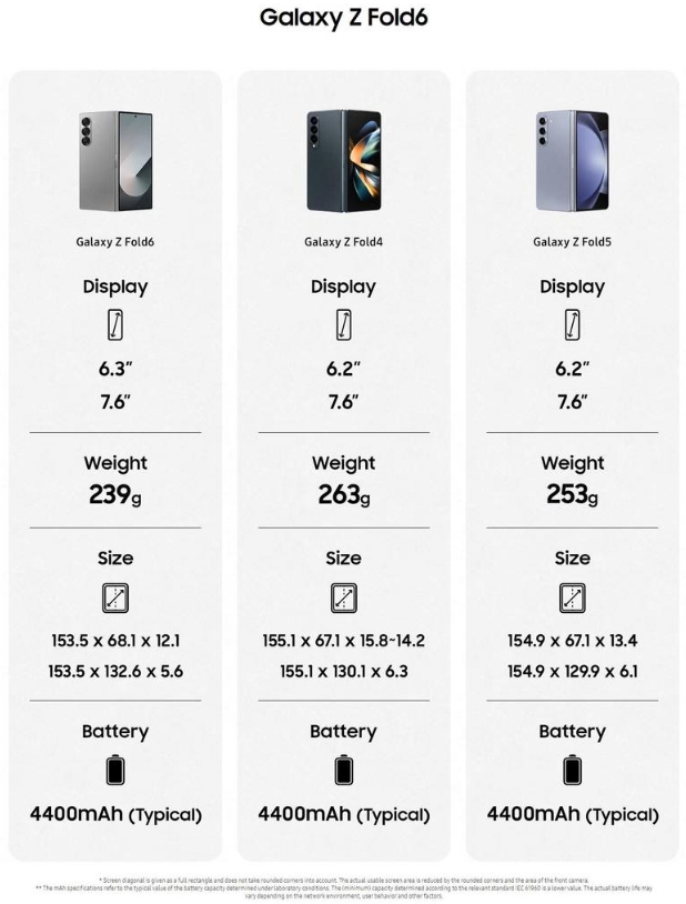 갤럭시 Z 폴드6은 전작인 갤럭시 Z폴드 5와 차별화된 ' 가볍고 슬림한 디자인'의 새로운 시대를 보여주고 있습니다. 무게가 14g 줄어들었고, 정사각형 비율에 더 가까운 콤팩트한 디자인을 선보이고 있습니다.
